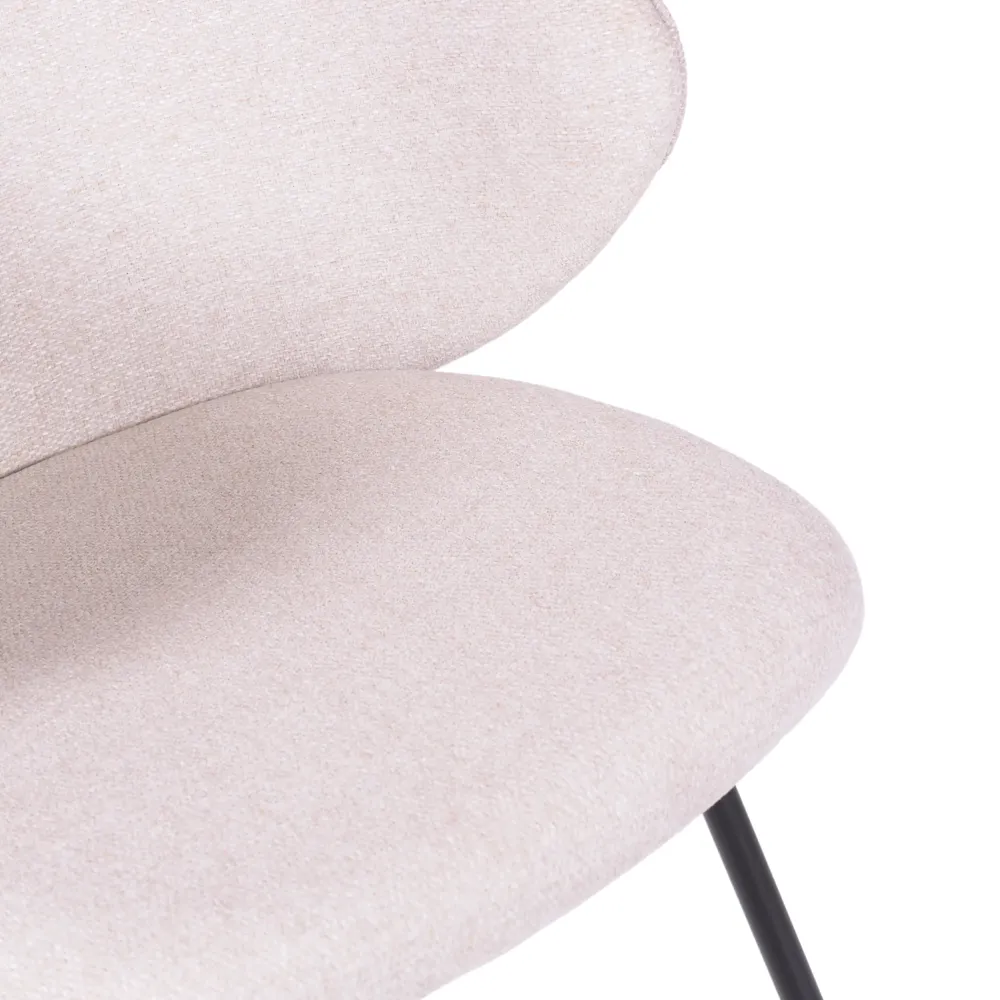 Esta silla está revestida con poliéster de alta calidad, un material resistente que ofrece una sensación suave y garantiza durabilidad en el tiempo. Las patas, en metal lacado en negro, aportan un toque de modernidad y estabilidad, complementando la estética general con un atractivo contraste visual entre el tapizado y el acabado metálico.